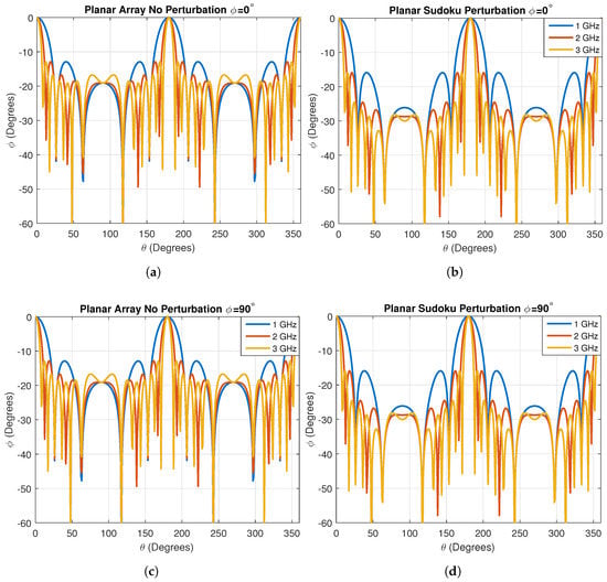 The size of the array has increased from 0.6λ× 0.6λ to 0.9λ× 0.9λ. We compare the resulting perturbed array to the equally-spaced planar array for the frequencies of 1, 2 and 3 GHz in Figure 23 for and . We clearly see lower side-lobes in the perturbed array. This suggests that the Sudoku-based perturbations are able to achieve good random arrays, resulting in better side-lobe performance.