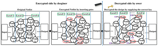 The vulnerability of chip security during manufacturing spurs the research on countermeasure methods. One of them is the logic encryption technique. Figure 1 presents the IC design flow combined with the logic encryption technique. Instead of shipping the original netlist to the offshore manufacturing foundry, a logic-gate level encryption technique is applied to protect the IP design with low cost. After retrieving the fabricated chips, in order to exhibit its correct functionality (produce correct outputs), the valid key has to be supplied to the encrypted design, for a certified IP owner to unlock the chips. However, upon employing the wrong key, the encrypted design will show the wrong functionality (produce wrong outputs).