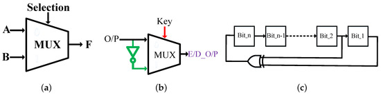 Figure 2a demonstrates a two-to-one basic multiplexer diagram. Equation (1) explains the Boolean operation. A and B are two inputs, while selection is the chosen input and F the output. Figure 2b illustrates an example of how the output can be determined by the key bit. If the key input is one, the Encryption/Decryption output (E/D_O/P) is equal to the complementary of the original output to encrypt the design; however, to decrypt the design, the E/D_O/P is equal to the original output (O/P) when the key input is zero. The functionality of the circuit can be changed based on the key value.