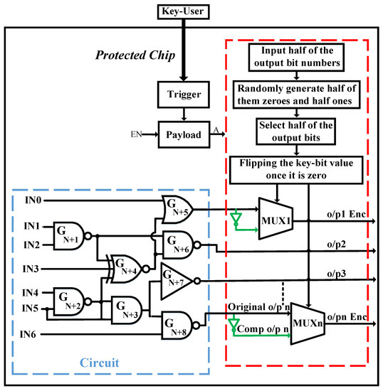 An assailant cannot figure out the functionality of the design because each output bit will be varied by changing the supplied key via the LFSR generator, which is used to generate random keys (each key is generated to have randomly half zeros and half ones, as mentioned). Since the key value is unpredictable due to the random generation, each output bit will be consequently arbitrary. Once the correct user key is inserted, the output of the payload will be set, and then, the enable (EN) of the LFSR generator will be disabled, while the activation signal (A) will be activated to initialize the values of the MUX’s selections. Then, the functionality of the circuit will be correct. If the value of one bit in the user key is incorrect, the corrupted output ratio will still be around 50%.