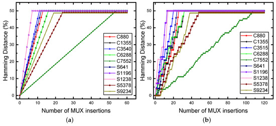 In addition, we evaluated the HD for all of the benchmarks that are mentioned in Table 1. For each benchmark, we only picked up one random key that was generated by the LFSR random key generation and fed it to each netlist to evaluate the HD between the correct and corrupt outputs based on half and full MUX insertions. Figure 6a,b demonstrates the analyzed HD for the ISCAS-85 and ISCAS-89 benchmarks based on the full and half MUX insertions for logic encryption, where the minimum required length of LFSR to achieve the HD in the figure is equal to the number of output bits. The HD for these benchmarks is 50%, except for S9234, which is 48.72% due to having an odd output number.