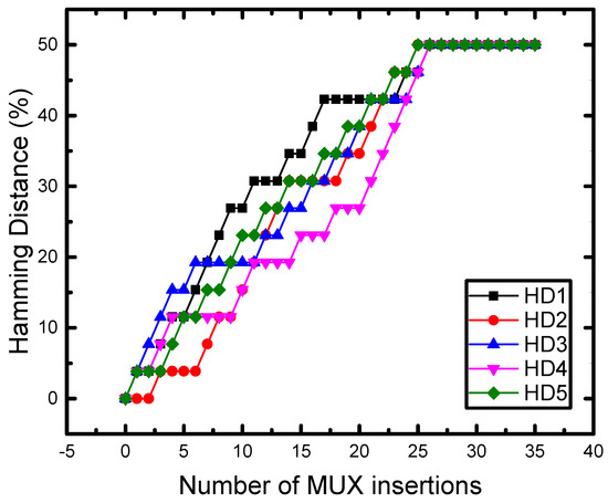 In our work, not only the functionality of the circuit is incorrect when the wrong user key is entered, but also the Hamming distance is always 50% or close to it, for whatever the input test patterns, the wrong input key and the size of the circuit are, unless the correct user key is inserted. To analyze the effectiveness of the random keys that the LFSR generated, we tested the C880 benchmark with five random keys using the full MUX insertion technique. First, we supplied 1000 random input patterns to the original C880 and monitored the correct output, then we supplied each key bit in each of these random keys with the same 1000 random inputs starting from the first bit until the last one by leveraging a shift register, to evaluate the HD for these five random keys. The HD was always 50% with different output patterns, as shown in Figure 7. This means that all of the output bits are always changeable and cannot be predicted, even if there is only one bit in the user key that is incorrect.