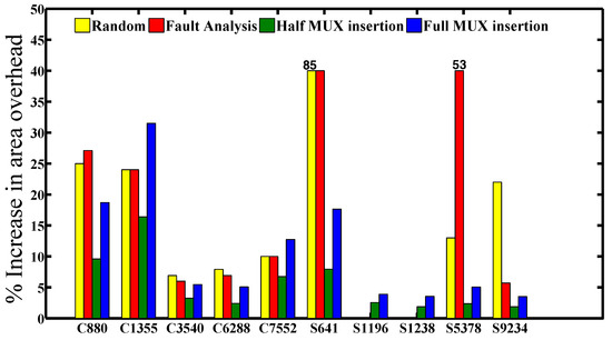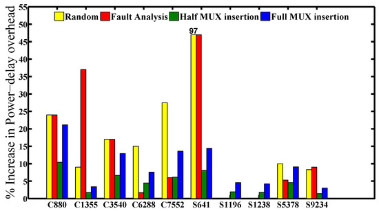 We measured the delay, power and area overheads for each benchmark circuit using the Synopsys design compiler as a tool with the 45-nm CMOS library. Since the MUXs were inserted only at the output of the netlist, the delay overhead (timing path) is almost zero for all of the benchmark circuits. Meanwhile, the power and area overheads for each benchmark depend on the number of output bits. Increasing the number of output bits will significantly increase the overheads for the area and power. Figure 9 and Figure 10 show the power-delay product and area overheads for all of the benchmark circuits that are listed in Table 1 with the corresponding number of MUX insertions that are mentioned in Column 3. From the figures, we can see the full MUX insertions consuming power and area approximately twice a half of the MUX insertions. The reason is obviously because the number of MUX insertions in full insertion is twice a half MUX insertions. It is worth noting that the half and full MUX insertions save area more than 2× and 3.6× and the power-delay product with more than 2× and 3.4× on average, respectively, compared to fault impact analysis.