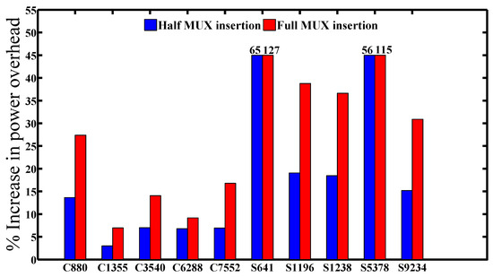 Instead of using RSA and PUF, we adopt both HLU and LFSR as a different technique to protect the secret key and generate random keys with 0.5 probability for each one, respectively, as mentioned in Section 4.1. Both the HLU and the LFSR random key generation are designed and synthesized with the full and half MUX insertions using Xilinx ISE. We also evaluate the delay, power and area overheads for the whole design, including all components. Figure 11 and Figure 12 demonstrate the total power and area overheads for the whole design, which are appropriate for several benchmark circuits, but are not suitable for other benchmarks, such as C880 and S641, due to the small area compared with S9234 and C6288. Moreover, the delay (timing path) overhead is very small for most of the benchmarks, except for C6288, which was 8.49%.