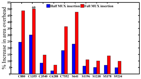 Comparing the area overhead of full and half MUX insertions for logic encryption.
