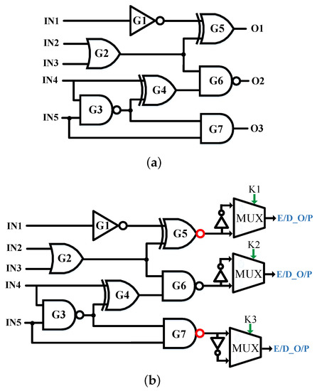 (a) Example for an original circuit; (b) the encrypted circuit using the MUX key-gate insertion technique.