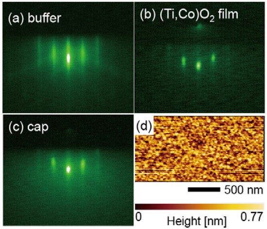 RHEED patterns of the buffer layer, the (Ti,Co)O2 film, and the capping layer showed a streak pattern with the flat sample surface observed via AFM (Figure 1), indicating the epitaxial growth and sharp interface between each layer.