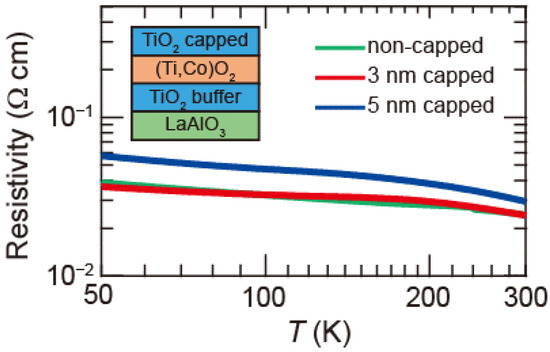 Temperature dependence of resistivity for Ti0.95Co0.05O2−δ epitaxial thin films with the capping layer of nonmagnetic TiO2 epitaxial thin films. The capping layer thickness was 0, 3, and 5 nm.