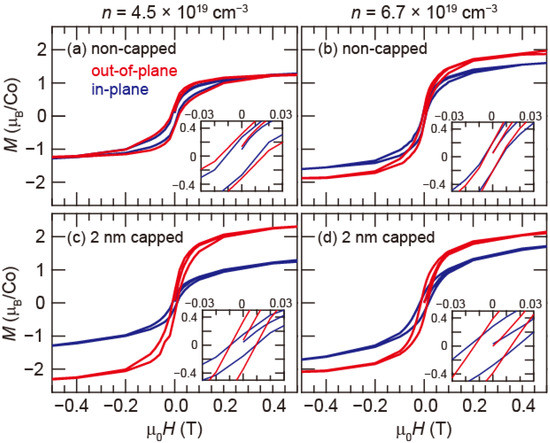 Figure 3 shows out-of-plane and in-plane magnetization curves at 300 K for Ti0.95Co0.05O2−δ films with and without a capping layer. In case of the films without a capping layer, the out-of-plane and in-plane magnetizations were approximately the same for n = 4.5 × 1019 cm−3 (Figure 3a), while the out-of-plane magnetization was slightly larger than the in-plane magnetization for n = 6.7 × 1019 cm−3 (Figure 3b), indicating their insignificant magnetic anisotropy. In case of the films with a capping layer, the out-of-plane magnetization was nearly doubled for n = 4.5 × 1019 cm−3 (Figure 3c), representing significantly enhanced out-of-plane magnetization and perpendicular magnetic anisotropy (Figure 3c). For n = 6.7 × 1019 cm−3, the out-of-plane magnetization was slightly increased (Figure 3d). It is noted that the in-plane magnetization in saturation was scarcely changed by the capping layer. However, the difference in magnetization slope between the in-plane and out-of-plane magnetization was enhanced (insets of Figure 3), indicating enlarged perpendicular magnetic anisotropy by the capping layer.