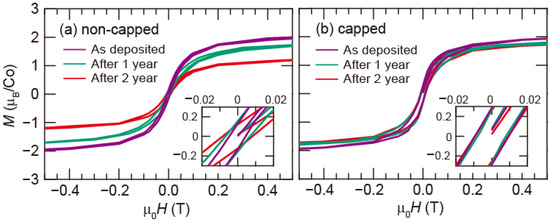 The aging of out-of-plane magnetization curves at 300 K for Ti0.95Co0.05O2−δ thin films (a) without a capping layer and (b) with a 2-nm-thick capping layer. Insets denote magnified views at around a zero magnetic field.