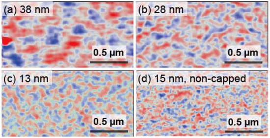 The effect of the 2-nm-thick capping layer on the magnetic domain structure in Ti0.95Co0.05O2−δ films with thicknesses from 13 nm to 38 nm was examined. Magnetization curves were almost the same with open hysteresis for all films, representing similar magnetization in a unit of Bohr magneton per Co site. The magnetic domain structure showed a weaker contrast with a smaller domain with decreasing thickness as a result of decreased thickness (Figure 5a–c), where the average domain width evaluated by a stereological method [19] was 160, 120, and 80 nm with decreasing thickness. It is noted that the magnetic domain structure was observed even for a thickness of 13 nm. On the other hand, a 15-nm-thick film without a capping layer showed smaller and irregularly shaped magnetic domains, probably caused by a magnetically dead layer on the surface and/or weak perpendicular magnetic anisotropy.