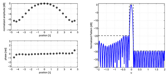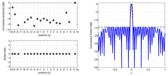 Furthermore, besides the asymmetric pencil beam case (where the power pattern mask was defined in the range to allow the scanning of the beam in the whole visible range without the appearance of the grating lobes), we have not considered the effect of the scanning of the beam; this could be achieved by simply increasing the range of u in which we want the satisfaction of the power pattern mask. Furthermore, in such a case, we could also take into account the presence of an element factor (that could change the side lobe level when the beam is scanned) by considering a modified power pattern mask, following the guidelines proposed in [28].
