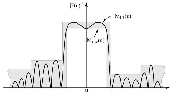 Let us now introduce a dense equispaced position ν-element vector in the range , with a spacing δ much smaller than , for instance , where λ is the free-space wavelength. Let be the excitation of such a dense array, and a μ-element vector sampling the u range in which the mask specifications are given; the radiation operator can be expressed as the matrix such that