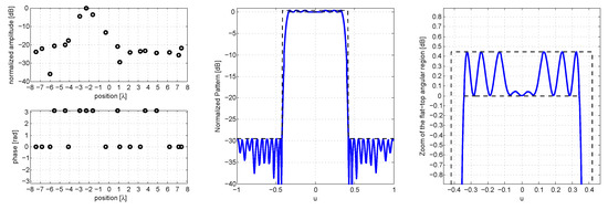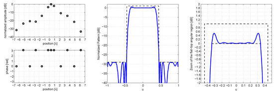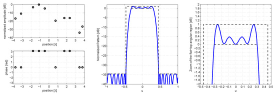 As the first test case, we will investigate a flat-top synthesized by other researchers [12,24,25] who have tried to minimize the number of feeds required to achieve the pattern with the desired specifications ( for , for ), finding that a minimum number of 10 elements is needed.