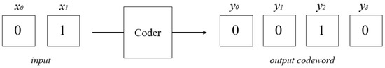 An example of the coding process is shown in Figure 1, and describes the transmission of the codeword , which may be converted to the decimal number 2 by considering the first bit as the less-significant one. The output of the coder corresponds to the positional codeword, where the bit equal to 1 in the third position (i.e., ) represents the decimal number 2. Actually, any different univocal mapping can be used, by just considering the constraint to have only one bit different from zero in the output codeword in order to keep the same low decoding complexity.