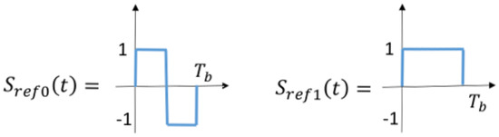 The transmission process ends by modulating the codeword bits of by using the reference signal waveforms and described in Figure 2, producing the transmitted continuous time signal . The described coder could be simply realized, for instance, by employing a low complexity boolean circuit with two signal inputs and four outputs.