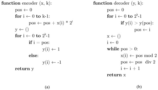 Pseudocode implementing the proposed scheme: (a) encoding and (b) decoding functions for a block of length k.