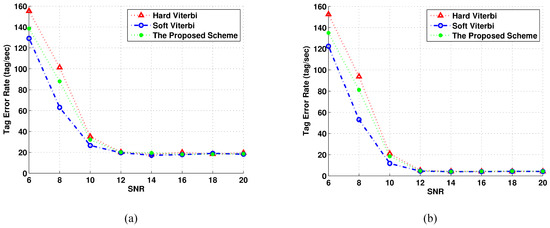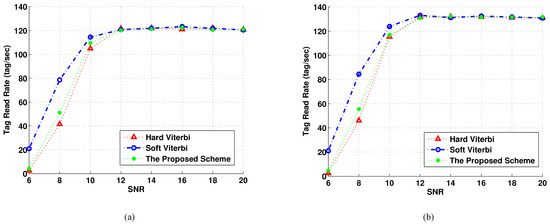 The three different coding schemes (i.e., the proposed algorithm, Hard Viterbi, and Soft Viterbi) have been compared in terms of tag read rate (TRR), defined as the number of successful tag query rounds of length in a unit of time, where is the average number of successful queries that occurs during the interval .