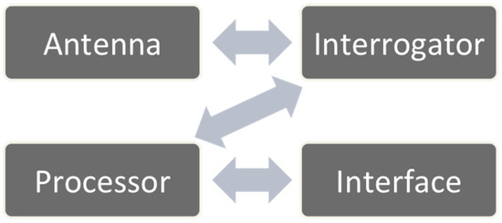 An RFID reader consists of four core components: antenna, RFID interrogator, processor, and user interface. The antenna and interrogator work in conjunction to gather and decode the tag information, which is then passed to the processor. The processor must be capable of retrieving information associated with the tag from a database and displaying it on the interface. To enhance the adaptability of the overall system, the core components are split into two groups capable of independent operation: the antenna and interrogator are grouped together, as are the processor and interface. A diagram demonstrating this relationship is shown in Figure 1.