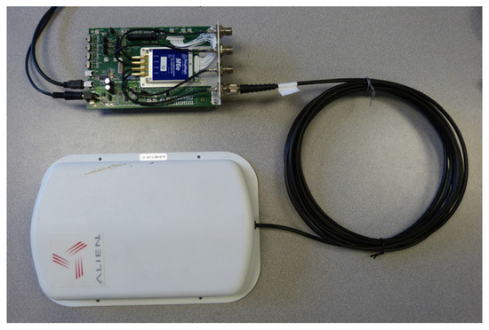 The initial prototype is constructed using a ThingMagic M6e Development Kit (atlasRFIDstore, Birmingham, AL, USA) as an interrogator, and a Windows 8.1 PC with a mouse and keyboard as the processor and interface. The communication between the interrogator and processor is achieved through a direct USB connection. A picture of the interrogator and antenna can be seen in Figure 2.