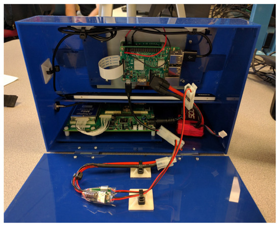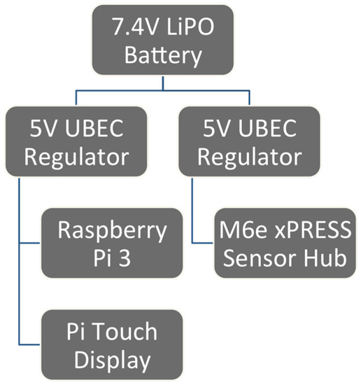 For the handheld base station and reader, a ThingMagic Mercury M6e xPRESS Sensor Hub is used as the interrogator. This unit has identical features to the development kit used for the initial desktop prototype, with the advantage of having an embedded operating system that allows for greater customization of operating parameters and the ability to communicate through a WiFi hardware module. The WiFi capability is central to the modular aspect of the design, as a layer of abstraction can effectively be created between the antenna/interrogator and the processor/interface components. Thus, tag information packets broadcast over WiFi by the xPRESS Sensor Hub can be received by a database server and retrieved by either a remote PC or a portable processor with integrated user interface. For the final portable hardware prototype, the processor and interface are comprised of a Raspberry Pi 3, a 7″ Pi Touch Display, and a Bluetooth keyboard. This prototype is powered by a 7.4 V LiPO battery along with two precision DC–DC UBEC regulators to supply the 5 V required by the Raspberry Pi, touch display, and Thing Magic xPRESS Sensor Hub. The UBEC regulators are chosen due to their low cost, regulation precision over a wide range of input voltages, and high current sourcing capabilities. A power distribution diagram for the portable modular unit is shown in Figure 3.