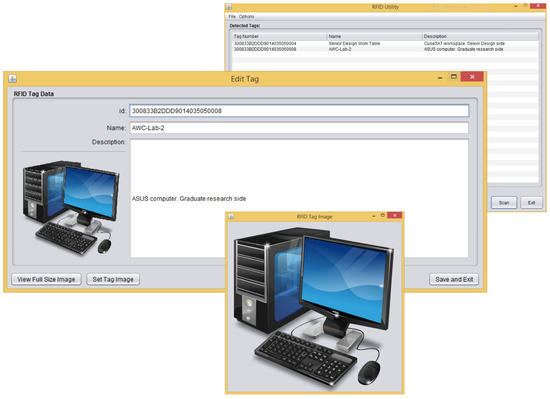 The developed software is written in Java due to its wide adoption as the language of choice for enterprise-quality software. As seen in Figure 4, the user interface is structured around a main window where all tags within the reading range are displayed. Each visible tag can be double-clicked on to retrieve its information from the linked database, including the RFID tag number, the name of the associated item, a description of the item, and a picture of the item. A full-sized picture of the item can also be accessed from this user screen. All values except the RFID tag number can be modified from this screen. The information stored in the development database is primarily for demonstration purposes, and the developed modular RFID system is capable of enhancing/extending the type and amount of data to be stored in the database based on the application type.