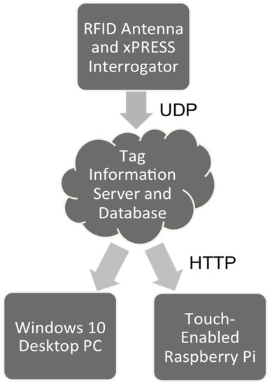 The desktop client software is designed to retrieve current tag reads from the database server and is utilizing a standard desktop operating system. The used PC had Windows 8.1 installed and the software is written using Java which is compatible with recent releases of Windows, Macintosh, and Linux. An Alien 915 MHz right-hand circular polarized antenna is used in this prototype version. The ThingMagic interrogator and Alien antenna are capable of reading Gen2 RFID tags in the regulated frequency band, 902–928 MHz. The antenna can be easily swapped for a more specialized and potentially smaller and directive/focused antenna to target the needs of specific applications.