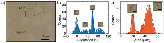 The CVD growth of MoS2 is based on the gas-phase reaction between MoO3 (≥99.998% Alfa Aesar) and high-pure sulfur evaporated from the solid phase (≥99.99% purity, Sigma Aldrich), for detailed information about the growth see reference [22]. Figure 1a shows an optical microscopy image (epi-illumination mode) of a 60 × 60 µm region of the sample containing single-layer MoS2 crystallites grown onto the sapphire surface. Most of the crystallites have approximately an equilateral triangular shape and they appear to be oriented following preferential orientation with respect to the sapphire lattice as previously reported [22,23]. As can be seen in the right part of the picture, some of the crystallites can coalesce and merge. In this article we focus only on the isolated triangular MoS2 crystallites for our analysis. To extract statistical information about the geometry of the MoS2 crystallites, we collected 50 optical images (108 × 86 µm) of the sample surface, taken in different regions. From each image we extract the area and the orientation of the single-layer MoS2 triangular crystallites.