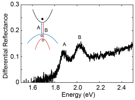 The optical characterization of the single-layer MoS2 crystallites has been carried out with differential reflectance spectroscopy. More details on the technique and about the experimental setup can be found in Reference [24] but briefly we illuminate a 60 µm spot on the sample surface with white light and we collect the light reflected from an area of the sample of 2 µm in diameter. Subtracting the intensity reflected by the bare substrate from the intensity of the light reflected by the MoS2 flake, and normalizing the result by the intensity reflected by the MoS2, one can extract a differential reflectance spectrum, which in the case of a thin film is proportional to the absorption of the thin film [25,26].