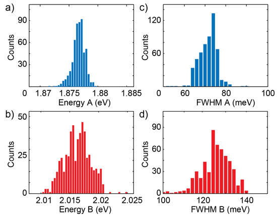 Extracted data from Differential reflectance measurement: (a,b) Histograms of the A and B exciton energy for 550 flakes. (c,d) Histograms of the full width at half maximum of the A and B excitons peaks.