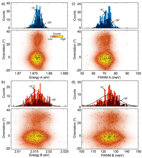 In order to get a deeper insight in this spectrum-to-spectrum fluctuations observed in CVD MoS2 sample, we investigate the correlations between the A and B exciton energy and FWHM and the geometrical parameters of the MoS2 islands such as the area and the orientation. Figure 4a shows the correlation between the A exciton energy with the triangle orientation. The bottom plot represents a scatter plot of the A exciton energy as a function of the island orientation (black dots) on top of a color map which depends on the data points density [30]. The scatter plot shows two clouds of data points corresponding to the most probable orientation (0° or equivalently 60°) and the least probable orientation (30° or 90°). Both clouds appear to be centered at the same A energy suggesting that the orientation does not affect the excitons in CVD MoS2. In the top panel we have included two one-dimensional conditional histograms of the A exciton energy, each constructed only from the islands belonging to one of the two orientation populations. The conditional histograms of the two populations appear similar and by fitting each histogram to a Gaussian peak we find that the difference in energy of the A exciton between the 0° and 30° orientation is (0.1 ± 0.1) meV, which can be considered zero within the experimental uncertainty. The uncertainty is calculated by propagating the standard errors of the peaks center. Similar conclusions hold for the energy of exciton B, presented in Figure 4b, the difference in the energy of the B exciton between triangles with 0° and 30° orientation is (0.4 ± 0.3) meV. We performed the same correlation analysis for the broadening (FWHM) of the A and B peaks. Figure 4c,d report similar plots for the excitons peak FWHM. Again we do not observe a correlation between the broadening of the excitons and the orientation of the MoS2 islands and finding a negligible difference between the two distributions, (0.4 ± 0.5) meV in the case of exciton A and (1.5 ± 0.9) meV in the case of B. This small difference in average excitons energy for the different MoS2 orientations might be due to the different MoS2/sapphire interaction that could induce a different strain in the MoS2 layers with the 0° and 30° orientations [11,31].