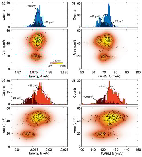 Finally, we perform the same correlation analysis discussed in Figure 4 to the MoS2 islands area instead of the orientation. Figure 5a,b show the correlation between the A and B exciton energy with the triangle area. The scatter plot shows two clouds of data points corresponding to the smallest triangle area (≈20 µm2) and to the largest area (≈47 µm2). Interestingly, while for exciton A both clouds appear to be centered at the same energy, in the case of exciton B the points related to the smaller area are shifted toward smaller energy. In the top panel we have included one-dimensional conditional histograms of the A (B) exciton energy, which are constructed only from the islands belonging to one of the two area populations. The conditional histograms of the two populations appear similar for the A exciton energy, and by fitting each histogram to a Gaussian peak we find that the difference in energy of the A exciton, between the small and the large area populations, is (0.4 ± 0.1) meV. In the case of the B exciton instead we find that the smaller area islands have an energy (3.0 ± 0.2) meV smaller than the large area ones. We performed the same correlation analysis for the broadening (FWHM) of the A and B peaks and Figure 5c,d report similar plots for the excitons peak FWHM. We do not observe a correlation between the broadening of the A exciton and the area of the MoS2 islands finding a negligible difference of (0.5 ± 0.5) meV between the two distributions. The B exciton FWHM shows instead a marked difference of (7.5 ± 1.0) meV between large and small areas.