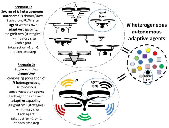 Schematic of the two scenarios to which our mathematical analysis and results can be applied. Scenario 1 is a population of N airborne drones, each of which has minimal on-board capability that includes s algorithms (i.e., strategies) for deciding the drone’s next action based on the previous global system outcomes, and a memory of size m comprising the previous m global outcomes that the drone receives at each timestep. Scenario 2 is a single, complex drone with N sensor/actuator agents, each of which has its own set of s algorithms, and a memory of size m.