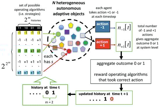 Our approach is inspired by, and draws together in a unified way, machinery from the field of complex systems and many-body statistical physics [,,]; recent works on a market-based approach to the distribution problem []; and works on scaling laws for such systems []. We refer to References [,] for more detail, as well as Reference [] for a more general formulation in the language of many-body physics. We start by recognizing the fact that despite their diversity in design details, size and weight, all drones tend to comprise some level of computing capability such as a single-board computer; sensors which give information about internal and external state of the craft; actuators which link through to engines or motors and propellers; some software which manages the system in real time and responds quickly to the changes observed in the sensor data; and of course a power supply, which is typically a lithium-polymer battery for small drones []. The key features of a drone that we incorporate explicitly into our modeling here are: the ability for data storage; the ability to sense information from the outside; the ability to take an action, for example to turn left or right in an attempt to access the less congested of two options, or to decide to transmit or not transmit through a potentially congested bandwidth; and the ability to adapt their decision making over time by having several algorithms stored whose relative ranking in terms of past performance is known (i.e., the drone processor knows at each timestep which is the better of the two operating algorithms (strategies)).