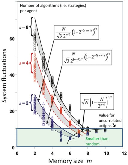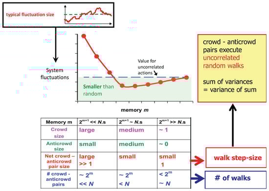 where for a random walk. All the strong correlations have been removed and so the separate crowd–anticrowd pairs execute random walks which are uncorrelated with respect to each other. This means that the total is given by the sum of the crowd–anticrowd variances, as stated in Equation (4). It is easy to show [,] for and that the number of agents playing the K’th ranked (i.e., K’th highest-scoring) strategy is given approximately by: