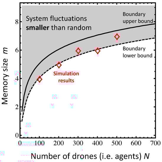 Figure 4 shows these closed-form results, and others from References [,], for which measures the system fluctuations due to crowding and hence congestion, as a function of drone memory size m. For each m, the spread in numerical values from individual simulation runs is also shown. The analytic expressions indeed capture the essential physics (i.e., the strong correlations) driving the fluctuations in the N-drone system.