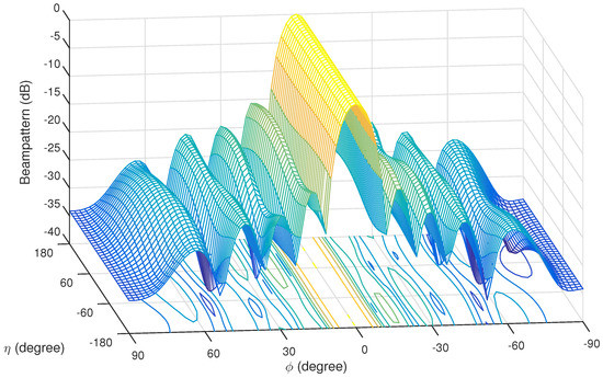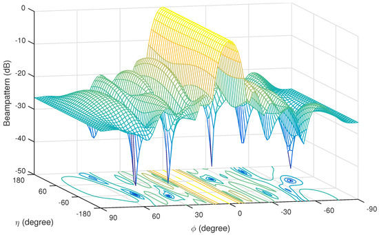Figure 2 shows the resultant 3-D beam pattern by the proposed full Q-Capon beamformer, where the interfering signals from () = (30°, −80°), (−70°, 30°), (−20°, 70°), and (50°, −50°) have all been effectively suppressed, while the gain of SOI from ° stays almost constant.