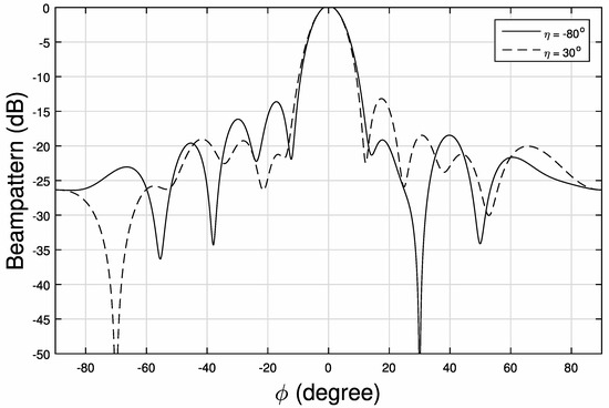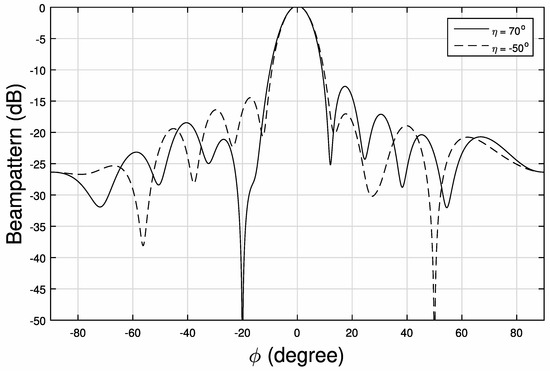 Figure 3 and Figure 4 show the 2-D beam patterns for , respectively, where deep nulls have been formed at locations .