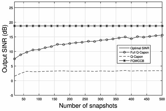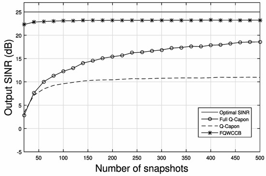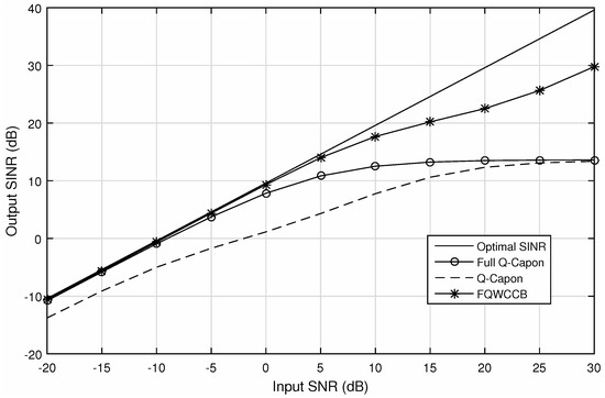 Firstly, we consider a scenario without steering vector mismatch. Figure 6 shows the output SINR performance versus SNR with 100 snapshots, where the solid-line is for the optimal beamformer (i.e., with infinite number of snapshots). Note that with only 100 snapshots, there will be non-negligible data model errors. It can be seen that for most of the input SNR range, the FQWCCB has the best output SINR performance versus the input SNR, while the full Q-Capon has a worse performance, but it still outperforms the Q-Capon beamformer. In the lower SNR range, FQWCCB and the full Q-Capon beamformer have a similar result, but the gap becomes greater from input SNR = 10 dB onwards. Additionally, in the lower range, the proposed full Q-Capon beamformer has a better performance than the Q-Capon beamformer; for very high input SNR values, these two beamformers have a very similar performance.