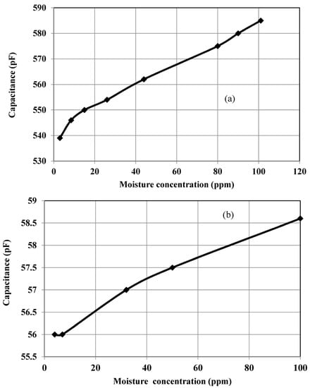 - Islam, T.; Nimal, A.T.; Mittal, U.; Sharma, M.U. A micro interdigitated thin film metal oxide capacitive sensor for measuring moisture in the range of 175–625 ppm. Sens. Actuators B 2015, 221, 357–364. [Google Scholar] [CrossRef]