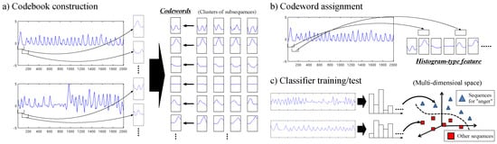 Figure 1 shows an overview of our codebook-based method, where emotion recognition on sequences of respiration rates is used as an example task. Our method consists of the following three steps: Firstly, the codebook construction step in Figure 1a collects subsequences from sequences and groups them into clusters of similar ones. A codebook is constructed as a set of codewords each of which is the centre of a cluster. Secondly, at the codeword assignment step in Figure 1b, the feature of a sequence is extracted by assigning each subsequence to the most similar codeword. In other words, this feature is a histogram representing the frequency of each codeword. Last, the classifier training/test step in Figure 1c is based on the fact that sequences represented by such features can be considered as points in a multi-dimensional space. A classifier is trained so as to discriminate between training sequences annotated with a certain activity class and those annotated with the others. In Figure 1c, such a classifier is depicted by the dashed line representing the boundary between the mental activity “anger” and the others. Based on this boundary, the classifier determines the activity class of a test sequence.