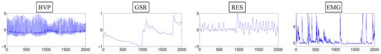 Examples of four types of physiological sequences in the dataset [11]. From the left, the first, second, third and last sequences represent values of Blood Volume Pressure (BVP), Galvanic Skin Response (GSR), RESpiration (RES) and ElectroMyoGram (EMG), respectively. Note that these sequences are normalised to have the mean zero and the variance one. In addition, to emphasise value changes, each type of sequence is plotted using the vertical axis with a different range.