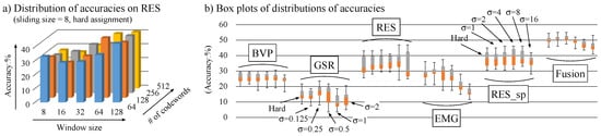(a) An example of an accuracy distribution based on different combinations of w and N; (b) Performance comparison between hard and soft assignments where accuracy distributions are summarised into box plots. Box plots marked as BVP, GSR, RES, EMG, RES_sp and Fusion indicate accuracy distributions obtained for blood volume pressure sequences, galvanic skin response sequences, respiration sequences, electromyogram sequences, respiration spectra, and their fusion, respectively.