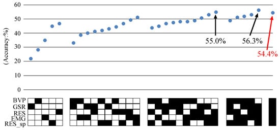 Transition of accuracies depending on fused features. The accuracies at the upper part result from fusing features expressed by the “fusion indicator” at the bottom part. The first, second, third, forth and last rows in the fusion indicator indicate the usages of features extracted from Blood Volume Pressure (BVP) sequences, Galvanic Skin Response (GSR) sequences, RESpiration (RES), ElectroMyoGram (EMG) sequences and RESpiration spectra (RES_sp). If a feature is used, the corresponding element is filled with black, otherwise it is white.
