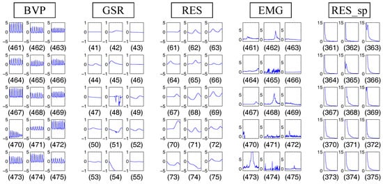 Finally, let us examine what kind of codewords are extracted by our method. For each feature, Figure 5 visualises 15 codewords that are extracted by grouping 37,600 subsequences collected by and into clusters. Rectangular regions display codewords (subsequences) representing values at 128 time points, except RES_sp for which the first 50 of 128 spectral amplitudes are displayed for clear visualisation. The number under a rectangular region indicates the ID of the corresponding codeword. For example, the top-left rectangular region in BVP presents the 461th codeword. As can be seen from Figure 5, our method could successfully extract codewords as subsequences exhibiting various characteristic value changes. In addition, one can further investigate codewords to discover knowledge about their relations to activities. For example, codewords specific to certain activities can be found by checking the entropy of a codeword over activities. In Figure 5, the 461th codeword for BVP appears 26 times over the whole set of sequences, but 25 appearances occur in sequences for “no-emotion” (). Moreover, 27 of 31 appearances of the 74th codeword for RES occur in sequences for “grief” (). This way, our codebook-based method offers an easy-to-use analytical tool where a user only has to tune three parameters w, l and N.