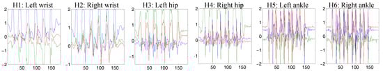 Examples of three-dimensional sequences from six accelerometers for the activity “jumping in place” in [22].