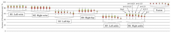 We follow the evaluation setting in [22] where sequences for the first seven subjects are used for training, and sequences for the remaining five subjects are used for testing. Codebooks are constructed only using training sequences. The performance of a method is evaluated with an accuracy (classification rate) representing the percentage of correctly classified sequences. The parameters w, l and N are set as follows: First, l is set to 2 by considering that sequences in this dataset relatively short, because they are collected with a low sampling frequency of 30 Hz. In other words, small l is needed to collect many subsequences from a short sequence, so that the resulting feature appropriately represents the distribution of codewords. The 15 combinations defined by and are tested, and accuracies obtained by them are summarised into a box plot. Note that a few sequences are too short and their lengths are less than w, so no subsequence can be collected. Such sequences are represented by the feature where all dimensions have zero. Finally, early fusion is used to concatenate six features each of which is computed using the same w, l, N and .
