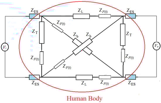 In a previous work, Asogwa et al. [20] showed that galvanic coupling signal propagating through the body changes as the body fluid level changes. Therefore, the attenuation can track changes in the amount of body fluid in real time using the circuit in Figure 1. The observed changes in the attenuation of an electrical signal passing through tissues can aid the diagnosis of body fluid disorder, such as lymphoedema. Thus, we modelled the propagation of an electrical signal passing through human tissues based on the input signal frequency, electrode-skin contact impedance [21], tissue dielectric properties [22], the human body physiological parameters [23], real-time dynamic changes in body fluid level [20] and the internal metabolic activities of an individual [24].