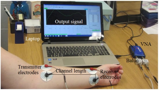 A mini Pro VNA, frequency range 100 kHz–200 MHz, manufactured by Mini Radio Solutions, baluns (Coaxial RF transformers, FTB-1-1+, turns ratio of one, manufactured by Mini-Circuits and bandwidth 0.2–500 MHz) and round pre-gelled self-adhesive Ag/AgCl snap single electrodes (1 cm diameter, manufactured by Noraxon Inc., Scottsdale, AZ, USA) were used. The baluns were used to electrically isolate the two ports of the VNA to ensure that the return current does not couple capacitively through the common ground. We measured 2.7 dB as the insertion loss of the balun, similar to manufactures specification of 2.0 dB between 800 kHz and 1.3 MHz. The VNA is set to sweep the constant interval frequency of range 300 kHz–200 MHz at 49 points with 0 dBm output power. Our frequency range lies between 800 kHz and 1.3 MHz, which matched those used in bioimpedance spectroscopy for whole-body fluid analysis [27], and lies in the region associated with the biological structure of living organisms. It has been stated that after ingestion, a propagating galvanic coupling signal would have maximum signal gain occurring between 900 kHz and 1.1 MHz [28]. Furthermore, this frequency falls within the range necessary to prevent radiation and human body antenna effects while ensuring good signal penetration into tissue spaces [22]. This frequency range lies within the safety limit set by the International Commission on Non-Ionizing Radiation Protection (ICNIRP, 1998) [29]. The Noraxon self-adhesive silver/silver-chloride electrodes (Ag/AgCl) are preferred because they are designed for both research and clinical use, contain hypoallergenic gel and can be used for two hours of measurement. They have better resistance to motion artefacts and refection compared to polarizable electrodes [30]. The distance between the transmit and receive electrodes is fixed to 20 cm. A sterilized hand glove was worn to ensure no direct skin contact with any of the subjects throughout the experiment. Nine subjects comprising 5 lymphoedema patients and 4 healthy individuals participated in the experiment. Subjects were asked to sit on a plastic chair with arms by the side to ensure the current was confined within the arm and avoiding external physical contact. All of the participants were told not to move as much as humanly possible. The measured arm resting on a wooden table (Figure 2) was insulated to ensure no current leakage and to ensure movement artefacts were minimized. The signal gain was measured 5 times at 3-min intervals, and the average was used. The experiment lasted for 30 min. Two separate experiments were conducted with the galvanic intrabody method; first, without fluid restriction and, second, with fluid restriction each on different days. Subject L5 was excluded on the third test, which required fluid restriction due to high blood pressure medication [31]. Fluid abstinence increases blood plasma concentration [32], which might affect blood pressure. On the third day, subjects were asked to abstain from fluid after supper till 10.00 a.m. The limb circumferences were again measured, and 350 mL of water were given to each subject to drink. five minutes were allowed for water to circulate into the body before measurement began [26]. This time, because of the initial fluid restriction, measurements were recorded for 20 min only to encourage the concentration and measurement of both arms were done simultaneously. Interference and background noises were minimised by switching off electronic devices and wireless systems around the vicinity. We also isolated communication cables away from power packs, and the laptop operated at battery mode. Since individual metabolism is different at different times of the day, we ensured that all measurements were done at 10.00 a.m. and that the average room temperature was maintained at C. Repeated measurements were taken and the average used to minimise measurement uncertainties. Measurements of healthy participants followed a similar procedure. All of the experiments followed the ethics procedures mandated by the Victoria University Human Ethics Research Committee.