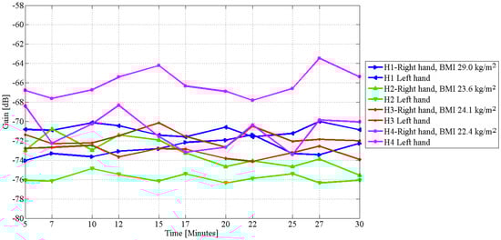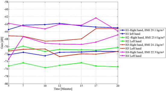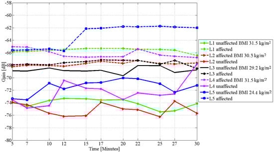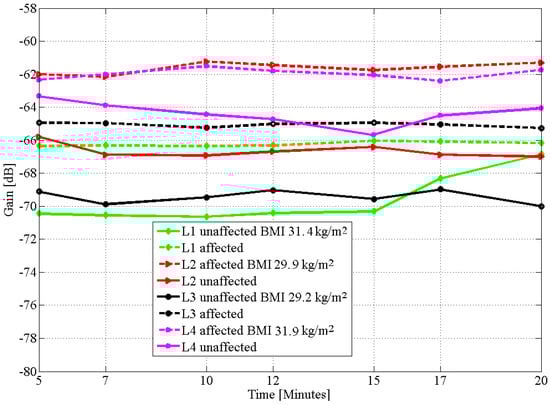 Table 4 and Table 5 are the deviations in time. After fluid restriction and ingestion of water, the rate of change in the signal gain was still more than 100% slower than the unaffected arm. Contrarily, the rate of change in the attenuation of the signal on the healthy subject, H1 for example, was 1.22 dB/min on the left limb and 1.32 dB/min, 8.2% between the two arms. Participants with lymphoedema affected disease had as much as a 55% difference between the affected and the contralateral part. Subject L5, besides lymphoedema, is treated for high blood pressure with amlodipine, a drug to increase the flow of blood [31], and was excluded from continuing with the experiment. The gain on his affected arm without fluid restriction was −65.59 dB, while the unaffected arm was −73.36 dB, as proposed in our theory. However, the change in attenuation at each point of measurement was possibly altered by the amlodipine medication.